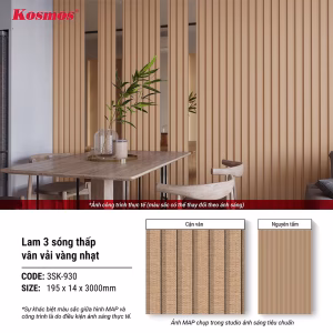 Tấm ốp lam 3 sóng vân vải vàng nhạt 3SK-930 là tấm ốp trang trí nội thất biên dạng 3 sóng thấp. Vật liệu kết hợp hoàn hảo giữa vẻ đẹp ấm cúng, mềm mại của họa tiết vân vải với sự cứng cáp, bền bỉ của vật liệu composite.