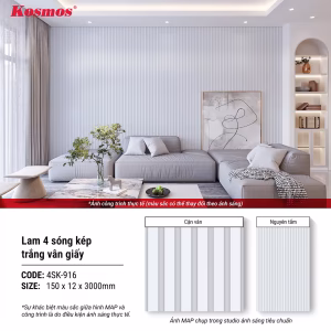 Tấm ốp lam 4 sóng thấp Tường Việt 4SK-916 trắng vân giấy là dòng tấm ốp trang trí nội thất được đánh giá cao về tính thẩm mỹ. Đây là loại tấm ốp tường và trần được sản xuất từ bột đá và nhựa PVC, có thiết kế bề mặt 4 sóng thấp màu trắng vân giấy tạo nên một giải pháp trang trí nội thất đẹp.