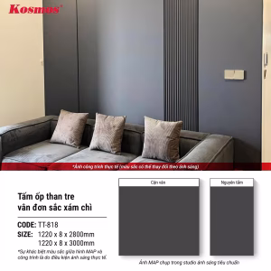 Tấm ốp than tre vân đơn sắc xám TT-818 có kích thước 2800 x 8 x 1220mm, trọng lượng ~18kg/tấm và 3000 x 8 x 1220mm, trọng lượng ~20kg/tấm nổi bật với các thông số kỹ thuật ấn tượng, đáp ứng các tiêu chuẩn nghiêm ngặt về chất lượng và tính thẩm mỹ.
