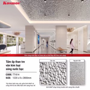 - Chi phí hợp lý: Tấm ốp than tre PET TT-814 mang đến vẻ đẹp giống các tấm kim loại thật nhưng có giá thành rẻ hơn.