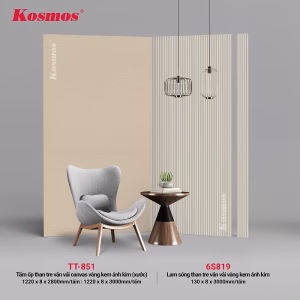 - Tấm ốp TT-851: 1220 x 8 x 2800/3000mm, bề mặt vân vải canvas vàng kem ánh kim, họa tiết xước.