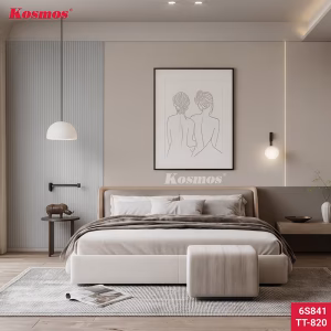 - Vách đầu giường: TT-820 làm nền toàn bộ, lam sóng 6S841 bổ sung chính giữa để tăng chiều sâu.