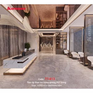 Tấm ốp tường/ốp trần than tre TT-813 có vẻ đẹp sang trọng, óng ánh như gương thật nhưng độ bền cao, không lo nứt vỡ. Sản phẩm cho phép thi công nhanh, sạch, hạn chế bụi, tiết kiệm chi phí hơn gương truyền thống. Đặc biệt, tấm ốp có thể uốn cong, bo góc linh hoạt.
