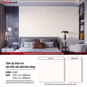 Tấm ốp than tre ánh kim trắng chống xước G-887 là sản phẩm tấm ốp tường, trần của Galawood, có kích thước 3000 x 1220mm và độ dày 8mm. Sản phẩm được cấu tạo từ 4 lớp chính: Lớp film PVC chống xước, lớp keo dán E0 an toàn, lớp cốt than tre có độ nén 0,65g/cm³ và lớp bảo vệ từ tính.