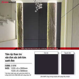 Tấm ốp đa năng sợi than tre ánh kim xanh đen chống xước G-898 là sản phẩm ốp tường, ốp trần màu xanh đen với bề mặt ánh kim sang trọng. Sản phẩm có kích thước 2800x1220mm, độ dày 8mm, trọng lượng khoảng 17kg/tấm và được cấu tạo từ 4 lớp chính: lớp film PVC 3D chống xước, lớp keo dán E0 không độc hại, lớp cốt than tre nén 0.65kg/cm³ và lớp bảo vệ từ tính chống nước.