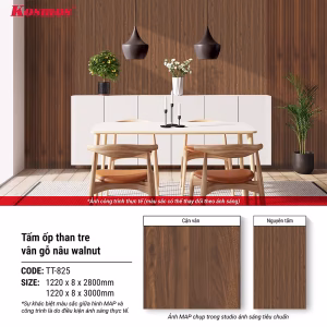 Có thể nói, tấm ốp sợi than tre vân gỗ nâu Walnut TT-825 là một minh chứng cho sự kết hợp hoàn hảo giữa công nghệ sản xuất tiên tiến và xu hướng thiết kế nội thất hiện đại. Với những ưu điểm vượt trội về chất lượng, tính thẩm mỹ và giá trị sử dụng, sản phẩm xứng đáng là lựa chọn hàng đầu cho các công trình kiến trúc đương đại.
