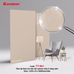 Điểm nhấn của tấm ốp than tre TT-861 đến từ thiết kế bề mặt. Sản phẩm sở hữu một bề mặt vân vải canvas, tạo cảm giác như vải thật nhưng thực chất lại là một bề mặt cứng cáp, chống xước và cực kỳ bền bỉ. Nhờ thiết kế chia ô màu vàng và xám xen kẽ, một sự kết hợp màu sắc đương đại, tấm ốp mang lại vẻ đẹp thanh lịch, sang trọng và không kém phần cá tính cho mọi bức tường.