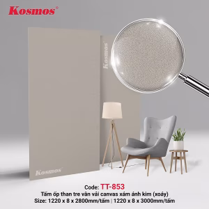 Tấm ốp than tre vân vải TT-853 có lớp film PVC 3D trang trí cao cấp, tạo hiệu ứng vân vải canvas xám ánh kim sang trọng. Lớp film dính chặt vào lớp cốt than tre bằng keo dán đạt chuẩn E0, an toàn cho sức khỏe. Sản phẩm đảm bảo độ bền với lớp cốt than tre có độ nén đến 0.7kg/cm³. Cuối cùng, mặt sau lớp cốt được che phủ bởi lớp bảo vệ từ tính chống ẩm.